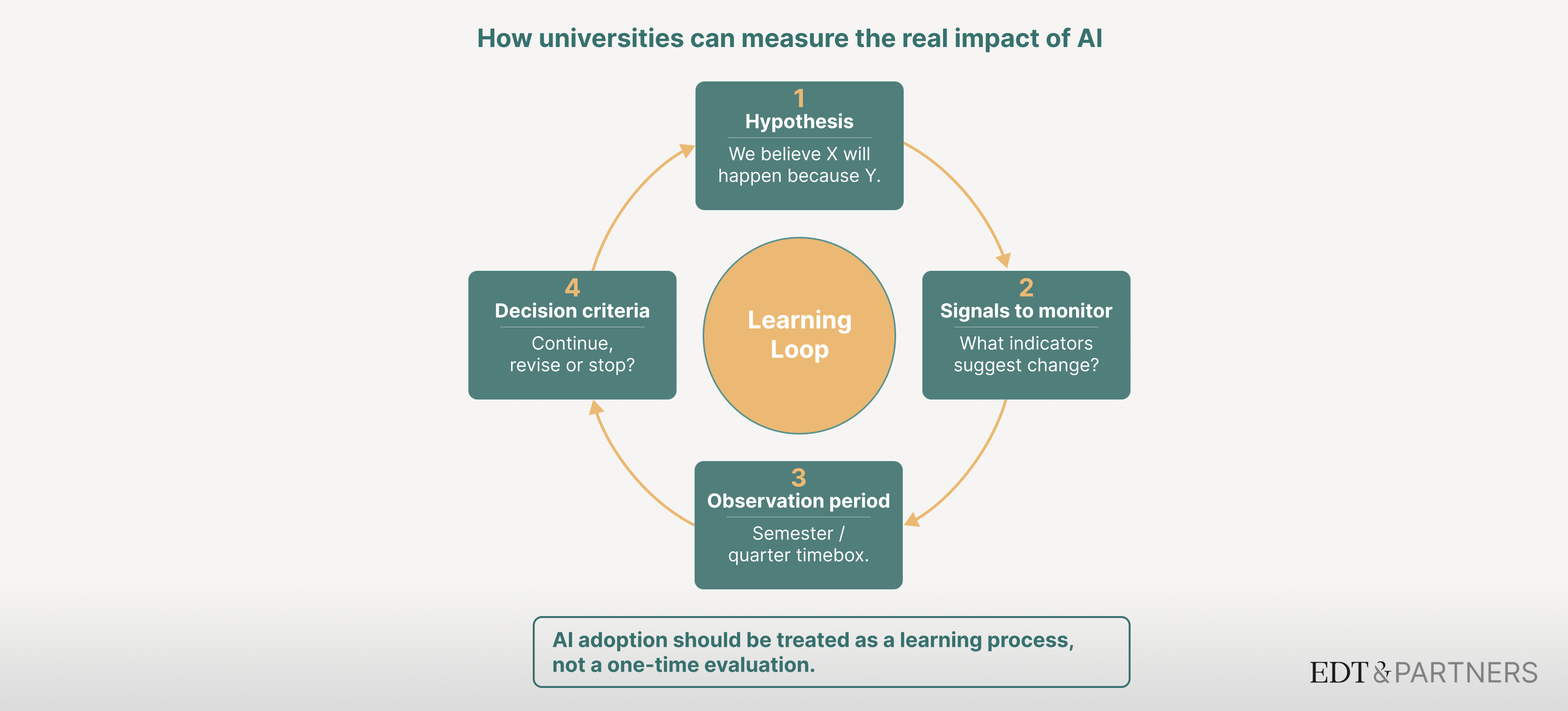 Defining and implementing learning loops at the unit level preserves autonomy. The risk for institutions is either paralysis while waiting for a comprehensive AI strategy, or fragmented experimentation that never aggregates into institutional insight.